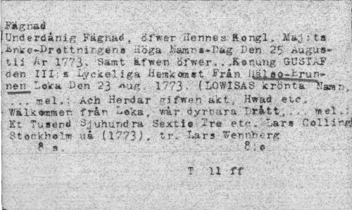 //// Pägn&d //// Underdånig Fägnae, öl>er Hennes ftongl. Maj; ta .-&nke-X>r«t'tnir:gen» Hbga £iamn*»Pag Ben 25 Augus» tli Ar 1773- Samt äfwen Öfwer...Konung GUSTAF den III: s Lyckeliga Hemkom»t Från liäiao-£run~-ne t; Lok a Den 23 1773- { LGWISAS krönta "Ila» n, //// . .. mel.; Ach Herdar glfwen akt4 Hwad ew, Walitommer. från L©ka, wår dyrbara Dr&it.,.. mel,: Et Tusend Sjuhundra Sexti» Tre etc. Lar» Colli'n# Stockholm «å (1773)» tr. Lars Wennbér* j a.' . ' //// T 11 ff ////