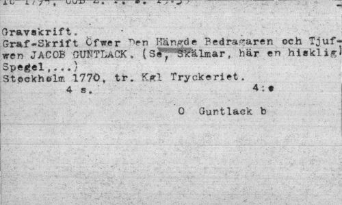 //// Gravskrift. //// Graf-Skrift Cfwer >n Hängde Bedragaren och Tjuf wen JACOB OUNTLACK. (Se, Skälmar, här en hisklig Spegel,...) //// Stockholm 1770, tr. Kftl Tryckeriet. //// 4 s. 4 : • //// 0 Guntlack b ////