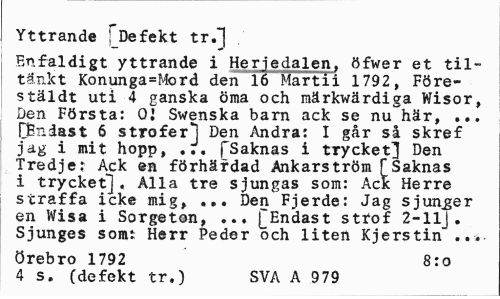 //// Yttrande [Defekt tr.] //// Enfaldigt yttrande i Herjedalen, öfwer et til-tänkt Konunga=Mord den 16 Martii 1792, Före-stäldt uti 4 ganska öma och märkvärdiga Wisor, Den Första: 01 Swenska barn ack se nu här, ... CFndast 6 strofer] Den Andra: I går så skref jag i mit hopp, ... fSaknas i trycket} Den Tredje: Ack en förhärdad Ankarström [Saknas i trycket], Alla tre sjungas som: Ack Herre straffa icke mig, ... Den Fjerde: Jag sjunger en Wisa i Sorgeton, ... fEndast stfof 2-11J . Sjunges somt Herr Peder och liten Kjerstin //// Örebro 1792 8:o //// 4 s. (defekt tr.) SVA A 979 ////