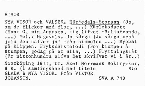 //// VISOR //// NYA VISOR och VALSER. Häriedals-Storsan (Ja, om de flickor med flor, ...J Kärleksduett (Han: O, min Augusta, mig lifvet förljufvande> ...) Mel.: Hagavals. Ja sörga (Ja sorga uppå jola den hafver ja' från himmelen ...) Byefeal på Klippen. Fryksdalsmelodi (För klumpen å stumpen, godag på er alla, ...) Flyttningslåt (År nittonhundra elfva Det skrifver vi i år..) //// Norrköping 1911, tr. Axel Norrmans Boktrycker» 8 s. (i samlingsband med titeln 8:0 //// GLADA & NYA VISOR. Från VIKTOR JOHANSON. SVA A 740 ////