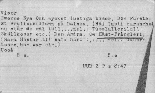 //// Visor //// Twenne Nya Och mycket lustiga Wisor, Den Första; St Bröllope-Glamm på Dalska, {Haj lusti curasch«l nu star de wäl täll, , . .mel,; Tu sslullerilul 1 i okiillkosan etc.) Den Andra; Om Häst-Prångl eri, / ' Rara Hästar til salu häri rTéTT ""^Wrr i //// iiiofiee, han war etc.) m //// Uooa m //// 8 ? o & //// UTJE Z p s 8; 47 Jf //// i ////