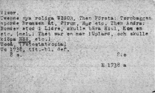 //// V isor. //// Iwenfse ny» roliga 1ISO.H, Then Första; ?»rnb»gg«n spöH* Bromsen åt, Ptrum, Hur etc. Th«n Andra; Bönder stod i Lidre, skulle bära Hiul, Kora ert etc. (mel: Tftet w&r en mar iUplard, och skulle <iSpa Höö, etc,) !Jooå, A Fotosta t kopta} <Jc 1738, tit .-ti. //// B s. P; o //// £ 1738 a ////