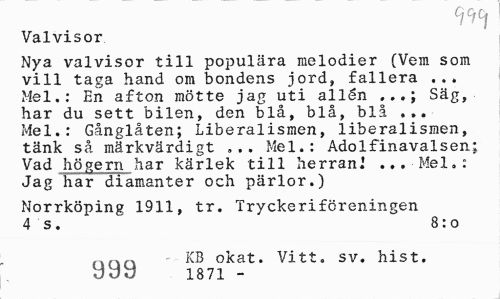 //// C/CfCf //// Valvisor //// Nya valvisor till populära melodier (Vem som vill taga hand om bondens jord, fallera ... Mel.: En afton mötte jag uti allén Säg, //// har du sett bilen, den blå, blå, blå ... Mel.: Gånglåten; Liberalismen, liberalismen, tänk så märkvärdigt ... Mel.: Adolfinavalsen; Vad högern har kärlek till herranJ ... Mel.: Jag har diamanter och pärlor.) //// Norrköping 1911, tr. Tryckeriföreningen 4 s. 8:0 //// f.ori KB okat. Vitt. sv. hist. //// yyy i87i - ////