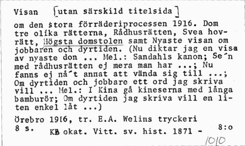 //// Visan j utan särskild titelsida //// om den Stora förräderiprocessen 1916. Dom tre olika rätterna, Rådhusrätten, Svea hovrätt, Högsta domstolen samt Nyaste visan om jobbafen och dyrtiden. (Nu diktar jag en visa av nyaste don ... Mel.: Sandahls kanon; Se"*n med rådhusrätten ej mera man har Nu //// fanns ej nå't annat att vända sig till ...; Om dyrtiden och jobbare ett ord jag skriva vill ... Mel.: I ICina gå kineserna med långa bamburör; Om dyrtiden jag skriva vill en liten enkel låt ...) //// Örebro 1916, tr. E.A. Welins tryckeri 8 s' KB okat. Vitt. sv. hist. 1871 - 8:0 //// /r>in ////