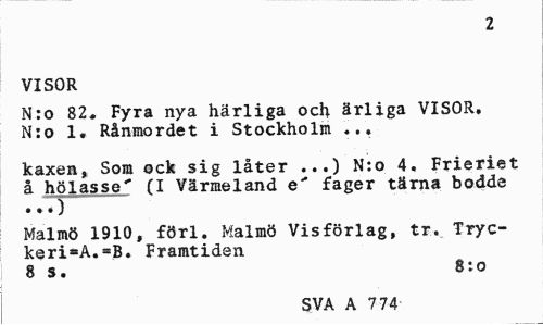 //// 2 //// VISOR //// N:o 82. Fyra nya härliga och ärliga VISOR. N:o 1. Rånmordet i Stockholm ... //// käxen» Som ock sig låter ...) N:o 4. Frieriet å hölasse* (I Värmeland e" fager tärna bodde //// Malmö 1910, förl. Malmö Vis förlag, tr. Tryc-keri^A.^B. Framtiden //// 8 s. 8:o //// SVA A 774 ////