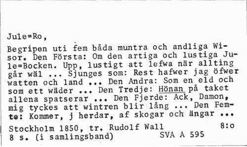 //// Jule=Ro, //// Begripen uti fem båda muntra och andliga Wisor. Den Första: Om den artiga och lustiga Ju-le=Bocken. Upp, lustigt att lefwa när allting går wäl ... Sjunges som: Rest hafwer jag öfwer watten och land ... Den Andra: Som en eld och som ett wäder ... Den Tredje: Hönan på taket allena spatserar ... Den Fjerde: Ack, Damon» mig tyckes att wintren blir lång ... Den Fem-ta: Kommer, j herdar, af skogar och ängar ... //// Stockholm 1850, tr. Rudolf Wall 8:0 //// 8 s. (i samlingsband) SVA A 595 ////