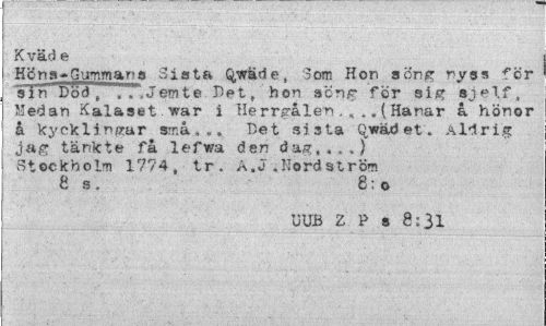 //// Kväd e //// Hön »»Gumman® Sista Q,wäde, Som Hon sön g nyss för sTn Död, .T.Jemte Pet, hon sön/r för sig sjelf, Medan Kalaset war i Herrgålen.K..(Hanar å hönor å kycklingar små,',,' Det sista Qwäd ef. Aldrig jag tänkte få lefwa den dag,..») Stockholm 1774, tr. A.«J .Hordström 8 s . 8: o //// UUB Z P s 8:31 ////