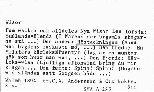//// Wisor //// Fem wackra och alldeles Nya Wisor Den första: Smålands=Blenda (I Wärend der urgamla skogarne stå ...) Den andra: Höstackningen (Anna war bygdens raskaste mö, T77J Den tredje: En Militärs kärleksäfwentyr (Jag är en munter gök som hwar man wet, ...) Den fjerde: Kär-leks=wisa (Ljufliga aftonwind bring du min klagan ... Den femte: Spinn.1 Spinn! (Ungmön wid sländan satt Sorgsen både ..,) //// Malmö 1894, tr.C.A. Andersson & C:s boktr. //// 8 s* sva A 8:0 ////
