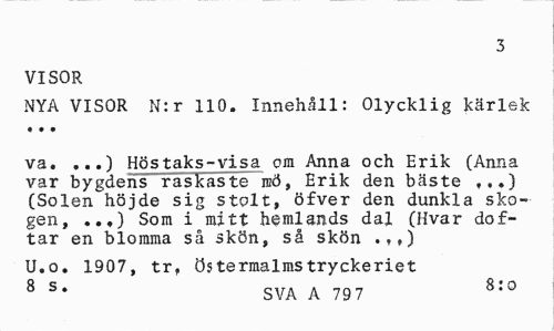 //// 3 //// VISOR //// NYA VISOR N:r 110. Innehåll: Olycklig kärlek . •» //// va. ...) Höstaks-visa om Anna och Erik (Anna var bygdens raskaste rcö, Erik den bäste ...) (Solen höjde sig stolt, öfver den dunkla skogen, ..?) Som i mitt hemlands dal (Hvar doftar en blomma så skön, så skön .,») //// U.o. 1907, tr, Östermalms tryckeriet //// 8 s. SVA A 797 8:o ////