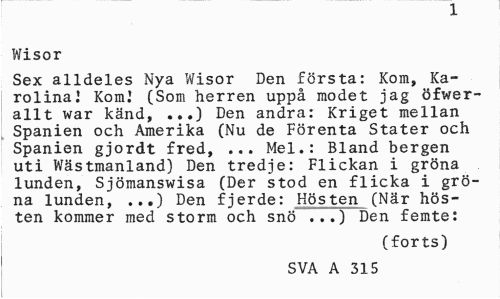 //// i //// Wisor //// Sex alldeles Nya Wisor Den första: Kom, Karolina! Kom.' (Som herren uppå modet jag öfwer-allt war känd, ...) Den andra: Kriget mellan Spanien och Amerika (Nu de Förenta Stater och Spanien gjordt fred, ... Mel.: Bland bergen uti Wästmanland) Den tredje: Flickan i gröna lunden, Sjömanswisa (Der stod en flicka i gröna lunden, ...) Den fjerde: Hösten (När hösten kommer med storm och snö ...) Den femte: //// (forts) //// SVA A 315 ////