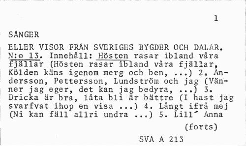 //// 1 //// SÅNGER //// ELLER VISOR FRÄN SVERIGES BYGDER OCH DALAR. N:o 13. Innehåll: Hösten rasar ibland våra fjällar (Hösten rasar ibland våra fjällar, Kölden käns igenom merg och ben, ...) 2. Andersson, Pettersson, Lundström och jag (Vänner jag eger, det kan jag bedyra, ...) 3. Dricka är bra, låta bli är bättre (I hast jag svarfvat ihop en visa ...) 4. Långt ifrå mej (Ni kan fäll allri undra 5. Lill"* Anna //// (forts) //// SVA A 213 ////