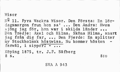 //// Wisor //// N- 11. Fyra Wackra Wisor. Den Första: En lördagsmorgon frun hon sa' ... Den Andra: Hwem sjöng jag för, hon war i skilda länder ... Den Tredje: Axel och Hilma. Sköna Hilma, snart jag från dig far, ... Den Fjerde: En splitter ny Stockholmsk hostwisa. Nu kommer hösten -farwäl, i sipporl -'".".. //// Köping 1875, tr. J.F. Säfberg 8 s. 8:o //// SVA A 943 ////