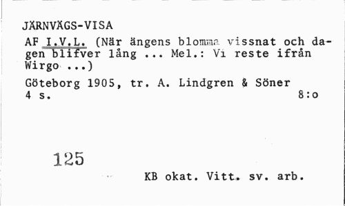//// JÄRNVÄGS-VISA //// AF I.V.Lv (När ängens blomma vissnat och dagen blifver lång ... Mel.: Vi reste ifrån Wirgo ...) //// Göteborg 1905, tr. A. Lindgren & Söner 4 s. 8:0 //// 125 //// KB okat. Vitt. sv. arb. ////
