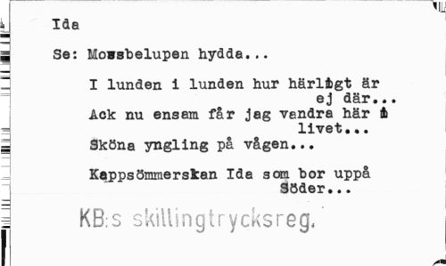 //// L Ida //// | Se: Mossbelupen hydda... //// I I lunden i lunden hur härligt är //// ej där... Ack nu ensam får jag vandra här i = livet... //// 1 Sköna yngling på vågen... //// Kappsömmerskan Ida som bor uppå //// Söder... //// i KB;S skillingtrycksreg, ////
