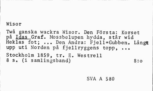 //// Wisor //// Twå ganska wackra Wisor. Den Första: Korset på Idas Graf. Mossbelupen hydda, står wid Heklas fot; ... Den Andra: Fjell=Gubben. Långt upp uti Norden på fjellryggens topp, ... //// Stockholm 1859, tr. E. Westrell 8 s. (i samlingsband) 8:0 //// SVA A 5 7 ////