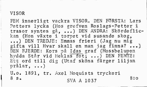 //// VISOR //// FEM innerligt vackra VISOR. DEN FÖRSTA: Lars Petters lycka (Hos grefven Roslags-Petter i trasor syntes gå, .T.) DEN ANDRA: Skördeflickan (Hon växte i torpet vid susande skog, ...) DEN TREDJE: Emmas frieri (Jag nu mig gifta vill Hvar skall en man iag finna? ...) DEN FJERDE: Kors nå Idas graf (Mossbelupen hydda Står vid HeklasTöt; ...) DEN FEMTE: Ett ord till dig (Utaf sköna färger liljan prålar, ...) //// U.o. 1891, tr. Axel Moquists tryckeri 8 s* SVA A 1037 8:0 ////