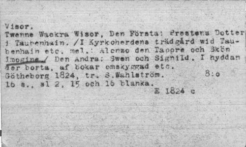 //// Visor, //// Tirenne Waekra Wisor, Den Första: ^rest^r.» Dottei i T»ubenh*in. /I Kyrkoherde»» trädgård wid benbain etc. rnel.: Al er*© der Tappre och 3Vcn t-nfwjnm / Den Andra; fwéti och SiacMld . I hyddan 9~er borta, af bokar omsky^ad etc. Göthebors; 1824, tr. S.fahlBtröm. 8:0 //// 16 a., si 2, 15 och 16 blanka. //// E 1Ö24 c ////