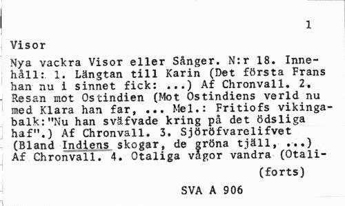 //// 1 //// Visor //// Nya vackra Visor eller Sånger. N:r 18. Innehåll: 1. Längtan till Karin (Det första Frans han nu i sinnet fick: ...) Af Chronvall. 2, Resan mot Ostindien (Mot Ostindiens verld nu med Klara han far, ... Mel.: Fritiofs vikingabalk: "Nu han sväfvade kring på det ödsliga haf".) Af Chronvall. 3. Sjöröfvarelifvet (Bland Indiens skogar, de gröna tjäll, ...) Af Chronvall. 4. Otaliga vågor vandra (Otali- //// (forts) //// SVA A 906 //// i ////