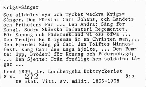 //// Krigs=Sånger //// Sex alldeles nya och mycket wackra Krigs= Sånger. Den Första: Carl Johans, och Landets och Frihetens Far ... Den Andra: Sång för Xongl. Södra Skånska Infanteri Regementet. För Konung och Fädernesland wi oss öfwa... Den Tredje: En Krigsman är en Christen man,... Den Fjerde: Sång på Carl den Tolftes Minnesfest. Kung Carl den unga hjelte, ... Den Femte: Upp, Bröder! för Konung och Fädernebygd; ... Den Sjette: Från fredligt hem soldaten tågar ... //// Lund 18394 tr. Lundbergska Boktryckeriet 8 s. 272 8:0 //// KB okat. Vitt. sv. milit. 1835-1938 ////