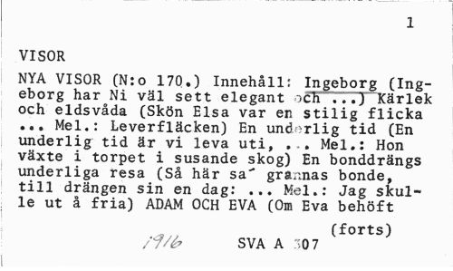 //// 1 //// VISOR //// NYA VISOR (N: o 170.) Innehåll: Ingeborg (Ingeborg har Ni väl sett elegant och 777} Kärlek och eldsvåda (Skön Elsa var en stilig flicka ... Mel.: Leverfläcken) En underlig tid (En underlig tid är vi leva uti, ... Mel.: Hon växte i torpet i susande skog) En bonddrängs underliga resa (Så här sa"* grannas bonde, till drängen sin en dag: ... Mel.: Jag skulle ut å fria) ADAM OCH EVA (Om Eva behöft //// (forts) //// ;i/é> SVA A 0 7 //// 1 ////