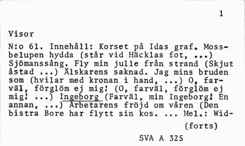 //// 1 //// Visor //// N:o 61. Innehåll: Korset på Idas graf. Mossbelupen hydda (står vid Häcklas fot, ...) Sjömanssång. Fly min julle från strand (Skjut åstad *.é) Älskarens saknad. Jag mins bruden som (hvilar med kronan i hand, ...) 0, farväl, förglöm ej mig! (O, farväl, förglöm ej mig! ...) Ingeborg (Farväl, min Ingeborg! En annan, .*») Arbetarens fröjd om våren (Den bistra Bore har flytt sin kos. ... Mel.: Wid- //// (forts) //// SVA A 4 325 ////