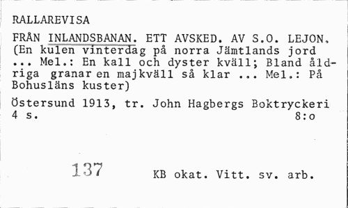 //// RALLAREVISA //// FRÄN INLANDSBANAN. ETT AVSKED. AV S.O. LEJON» (En kulen vinterdag på norra Jämtlands jord ... Mel.: En kall och dyster kväll; Bland åldriga granaren majkväll så klar ... Mel.: På Bohusläns kuster) //// Östersund 1913, tr. John Hagbergs Boktryckeri 4 s. 8:0 //// 137 KB okat. Vitt. sv. arb. ////