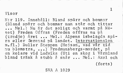 //// 1 //// Visor //// N:r 1X9. Innehåll: Bland spärr och bonunar (Bland spärr och bommar man står och tittar ... Mel.: Nu är det soligt och varmt på Näset) Freden Offras (Freden offras nu på (tredje) året ... Mel.: Alpens isbelagda spira eller Serenad på landet. Internationalen m.fl.) Buller Steppen (Hejsan, vad vår tid nu blomstra, ...) Fredmunsbergs-mordet, på en kolare vid Ludvika (Uti en skog i Värmland bland träsk å stubb å snår ... Mel.: Axel och //// (forts) //// SVA A 10 29 ////