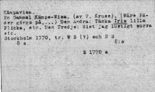 //// Kämpavisa. //// Er aammal Kämp«-Wisa. (av V. Kruse). (Wåre Fäder o på,...} Den Andra; Täcka Iris lilla Flicka, etc. Den Tredje: Sist jag lustTgt surra t tc. //// Stockholm 1770, tr. 15/ B (?) och N 3 //// 8 3. 8;o //// E 1770 a ////