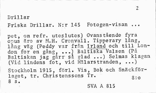 //// 2 //// Drillar //// Friska Drillar. N:r 145 Fotogen-visan ... //// pet, om refr. uteslutes) Ovanstående fyra opus äro av M.H. Cronvall. Tipperary lång, lång väg (Peddy var från Irland och till London for en gång, ...) Baltiska Valsen (På Baltiskan jag gårr så glad ...) Selmas klagan (Vid lindens fot, vid Mälarstranden, ...) //// Stockholm 1915, förl. Vis, Bok och Snäckför-laget, tr. Christenssons Tr. g //// B s * //// SVA A 815 ////
