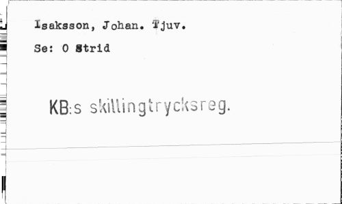 //// j Isaksson, Johan. 'i'juv. //// i Se: 0 Strid //// 1 KB:S skillingtrycksreg. //// ¦j //// i ////