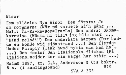 //// Wisor //// Fem alldeles Nya Wisor Den första: Jo om morgnarna (När på varieté nå"n gång ... Mel.: Ta=Ra=Ra=Bom=Tra=La) Den andra: Skoma-j, karewisa (Wänta ni tills jag blir stor //// "Känd melodi") Den underbara harpan (Der bodde en bonde wid sjöastrand ...) Den fjerde: Under Paraply (Tänk hwad nytta man kan ha". ...) Den femte: Den italienska flickan (På Italiens nejder der min wagga har stått ...) //// Malmö 1897, tr. C.Å. Andersson & C:s boktr. 8 s. (i samlingsband) 8:0 //// SVA A 2 35 ////