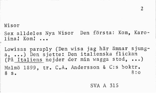 //// 2 //// Wisor //// Sex alldeles Nya Wisor Den första: Kom, Karolina.' Kom.' ... //// Lowisas paraply (Den wisa jag här ämnar sjung-a, ...) Den sjette: Den italienska flickan (På Italiens nejder der min wagga stod, ..„) //// Malmö 1899 , tr. G.A. Andersson & C:s boktr. 8 s. 8 :o //// SVA A 315 ////