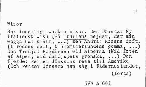 //// 1 //// Wisor //// Sex innerligt wackra Wisor. Den Första: Ny italiensk wisa (På Italiens nejder, der min wagga har stått, ...) Den Ändra: Rosens doft, (I rosens doft, i blomsterlundens gömma, ...) Den Tredje: Herdinnan wid Alperna (Wid foten af Alpen, wid daldjupets grönska, ...) Den Fjerde: Petter Jönssons resa till Amerika (Och Petter Jönsson han såg i Fäderneslandet, //// (forts) //// SVA A 602 ////