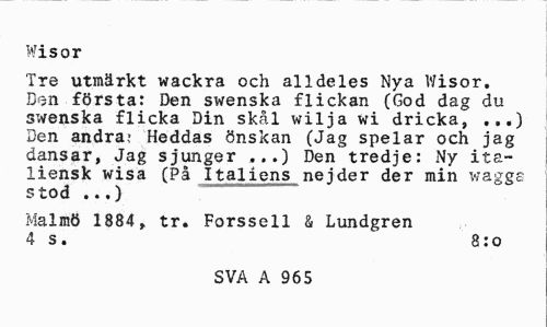 //// Wisor //// Tre utmärkt wackra och alldeles Nya Wisor. Den första: Den swenska flickan (God dag du swenska flicka Din skål wilja wi dricka, ...) Den andra; Heddas önskan (Jag spelar och jag dansar, Jag sjunger ...) Den tredje: Ny italiensk wisa (På Italiens nejder der min waggs stod ...) //// Malmö 1884, tr. Forssell & Lundgren 4 s. 8:0 //// SVA A 965 ////