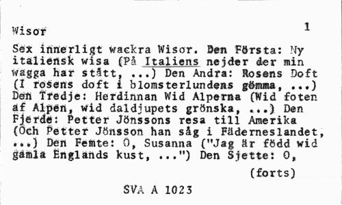 //// 1 //// Wisor //// Sex innerligt wackra Wisor. Sen Första: Ny italiensk wisa (På Italiens nejder der min wagga har stått, ...) Den Andra: Rosens Doft (I roSens doft i blomsterlundeas gömma, ...) Den tredje: Herdinnan Wid Alperna (Wid foten äf Alpen, wid daldjupets grönska, Den //// Fjerde: Petter Jönssons resa till Amerika (Och Petter Jönsson han såg i Fäderneslandet, Dén Femte: 0, Susanna ("Jag är född wid gamla Englands kust, ...") Den Sjette: 0, //// (forts) //// SVA A 102 3 ////