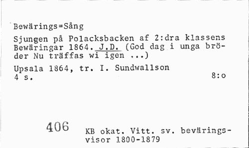 //// Bewärings=Sång //// Sjungen på Polacksbacken af 2:dra klassens Bewäringar 1864. J.D. (God dag i unga bröder Nu träffas wi igen ,..) //// Upsala 1864, tr. I. Sundwallson 4 s. 8:o //// 406 KB okat^ vitt. sv. bevärings- //// visor 1800-1879 ////