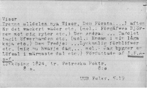 //// Vi ser //// Xrenn* alldeles nya Wisor, Den Första;...} af t or. Hr det vackert wäder etc. (mel.: Förgäfwes EJ örren möt mig ryter etc.) Der >rdra. ... Ta^dlet tagit ö furor hand en etc, (mel.; Enswr. i mir låga koja etc.) Den Tredje; .. .I.yck mf.1 i g forblifwér etc. (mig nu hvrarje dag,... mel.- Jag bygger er Lcfsal i närmaste dal etc.) Förfa* tade af 7. F. A-P - . //// Ljr.kcping '824, tr-, Petreska Poktr. //// 8 8. 8; O //// UUB Folk v. <.19 ////