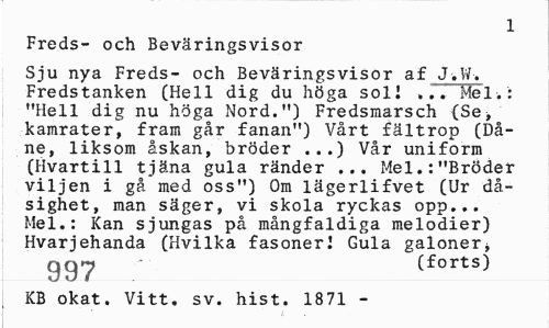 //// 1 //// Freds- och Beväringsvisor //// Sju nya Freds- och Beväringsvisor af J.W. Fredstanken (Hell dig du höga sol I ... Mel .: "Hell dig nu höga Nord.") Fredsmarsch (Se, kamrater, fram går fanan") Vårt fältrop (Då-ne, liksom åskan, bröder ...) Vår uniform (Hvartill tjäna gula ränder ... Mel.:"Bröder viljen i gå med oss") Om lägerlifvet (Ur dåsighet, man säger, vi skola ryckas opp... Mel.: Kan sjungas på mångfaldiga melodier) Hvarjehanda (Hvilka fasonerJ Gula galoner* ggy ' (forts) //// KB okat. Vitt. sv. hist. 1871 - ////