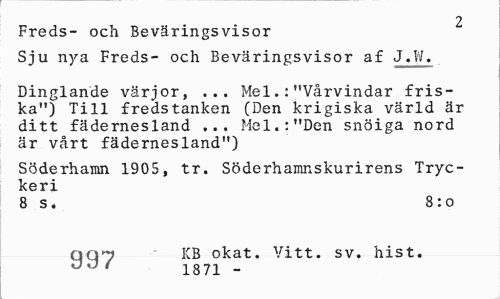 //// 2 //// Freds- och Beväringsvisor //// Sju nya Freds- och Beväringsvisor af J.W. //// Dinglande värjor, ... Mel.:"Vårvindar friska") Till fredstanken (Den krigiska värld är ditt fädernesland ... Mel.:"Den snöiga nord är vårt fädernesland") //// Söderhamn 1905, tr. Söderhamnskurirens Tryckeri //// 8 s. 8:o //// qq>7 KB okat. Vitt. sv. hist. //// 1871 - ////