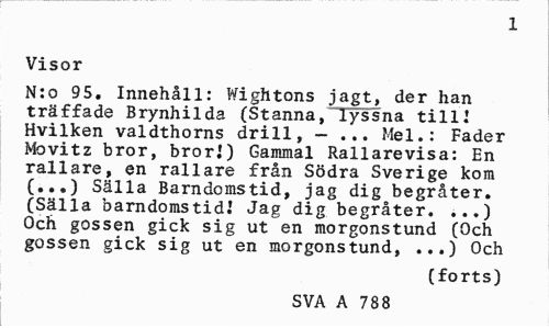 //// 1 //// Visor //// N:o 95. Innehåll: Wightons jagt, der han träffade Brynhilda (Stanna, lyssna till! Hvilken valdthorns drill, - ... Mel.: Fader Movitz bror, bror!) Gammal Rallarevisa: En rallare, en rallare från Södra Sverige kom (...) Sälla Barndomstid, jag dig begråter. (Sälla barndomstid.* Jag dig begråter. ...) Och gossen gick sig ut en morgonstund (Och gossen gick sig ut en morgonstund, ...) Och //// (forts) //// SVA A 788 ////