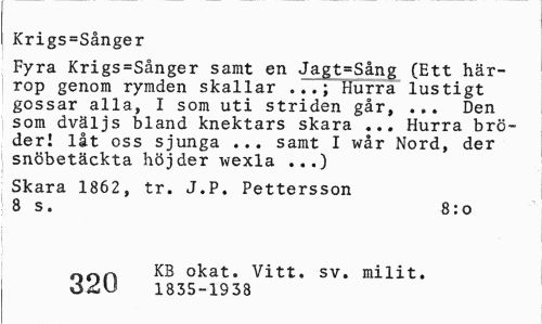 //// Krigs=Sånger //// Fyra Krigs=Sånger samt en Jagt=Sång (Ett härrop genom rymden skallar Hurra lustigt gossar alla, I som uti striden går, ... Den som dväljs bland knektars skara ... Hurra bröder! låt oss sjunga ... samt I wår Nord, der snöbetäckta höjder wexla ...) //// Skara 1862, tr. J.P. Pettersson 8 s. 8:0 //// oon KB okat. Vitt. sv. milit. 1835-1938 ////
