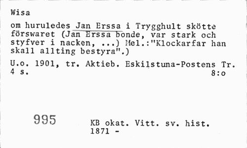 //// Wisa //// om huruledes Jan Erssa i Trygghult skötte förswaret (Jan Erssa bonde, var stark och styfver i nacken, ...) Hel.:"Klockarfar han skall allting bestyra*1.) //// U.o. 1901, tr. Aktieb. Eskilstuna-Postens Tr. 4 s. 8:0 //// 995 KB okat. Vitt. sv. hist. //// 1871 - ////