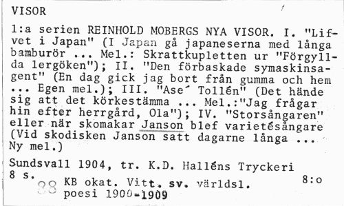 //// VISOR //// 1:a serien REINHOLD MOBERGS NYA VISOR. I. "Lif-vet i Japan" (I Japan gå japaneserna med långa bamburör ... Mel.: Skrattkupletten ur "Förgyllda lergöken"); II. "Den förbaskade symaskinsagent" (En dag gick jag bort från gumma och hem ... Egen mel.); III. "Ase" Tollén" (Det hände sig att det körkestämma ... Mel.:"Jag frågar hin efter herrgård, Ola"); IV. "Storsångaren" eller när skomakar Janson blef varietésångare (Vid skodisken Janson satt dagarne långa ... Ny mel.) //// Sundsvall 1904, tr. K.D. Halléns Tryckeri //// 8 S* o o KB okat. Vitt. sv. världsl. 8:0 //// - poesi 1900-19Ö9 ////