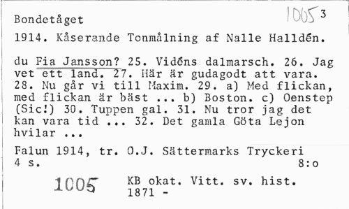 //// Bondetåget löbS3 //// 1914. Kåserande Tonmålning af Nalle Halidén. //// du Fia Jansson? 25. Vidéns dalmarsch. 26. Jag vet ett land. 27. Här är gudagodt att vara. 23. Nu går vi till Maxim. 29. a) Med flickan, med flickan är bäst ... b) Boston, c) Oenstep (Sicl) 39. Tuppen gal. 31. Nu tror jag det kan vara tid ... 32. Det gamla Göta Lejon hvilar ... //// Falun 1914, tr. O.J. Sättermarks Tryckeri 4 s. 8: o //// 1CÖ5T KB okat' Vitt* sv> ////