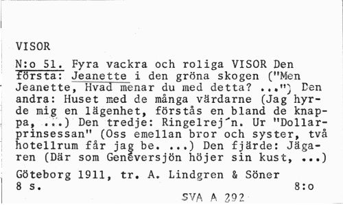 //// VISOR //// N:o 51. Fyra vackra och roliga VISOR Den första: Jeanette i den gröna skogen ("Men Jeanette, Hvad menar du med detta? ...") Den andra: Huset med de många värdarne (Jag hyrde mig en lägenhet, förstås en bland de knappa, ...) Den tredje: Ringelrej^n. Ur "Dollarprinsessan" (Oss emellan bror och syster, två hotellrum får jag be. ...) Den fjärde: Jägaren (Där som Genéversjön höjer sin kust, ...) //// Göteborg 1911, tr. A. Lindgren & Söner 8 s. 8:o //// SVA A 292 ////