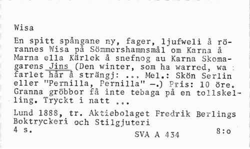 //// Wisa //// En spitt spångane ny, fager, ljufweli å rörannes Wisa på Sömmershamnsmål om Karna å Marna ella Kärlek å snefnog au Karna Skoma-garens Jins (Den winter, som ha warred, wa . farlet hår å strängj: .., Mel.: Skön Serlin eller "Pernilla, Pernilla" -.) Pris: 10 öre. Granna gröbbor få inte tebaga på en tollskel-ling. Tryckt i natt „,. //// Lund 1888, tr. Aktiebolaget Fredrik Berlings Boktryckeri och Stilgiuteri //// 4 s- SVA A 434 8:0 ////