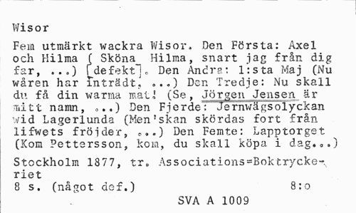 //// Wisor //// Fem utmärkt wackra Wisor. Den Första: Axel och Hilma ( Sköna Hilma, snart jag från dig far, ...) ("defekt"]* Den Andra: l':sta Maj (Nu wåren har lnträdt, ,..) Den Tredje: Nu skall du få din warma mat' (Se, Jörgen Jensen är mitt namn, .,..) Den Fjerde: "Jernwagsolyckan wid Lagerlunda (Men!skan skördas fort från lifwets fröjder, o..) Den Femte: Lapp tor ge t (Kom Pettersson, kom, du skall köpa i dag,,.) //// Stockholm 1377, tr» Associations=Boktryckeriet //// 8 s. (något def.) 8:0 //// SVA A 1009 ////