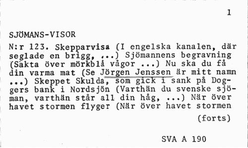 //// 1 //// SJÖMANS-VISOR //// N:r 12 3. Skepparvisa (I engelska kanalen, där seglade en brigg, ,..) Sjömannens begravning (Sakta över mörkblå vågor ...) Nu ska du få din varma mat (Se Jörgen Jenssen är mitt namn ...) Skeppet Skulda, som gick i sank på Dog-gers bank i Nordsjön (Varthän du svenske sjöman, varthän står all din håg, ...) När över havet stormen flyger (När över havet stormen //// (forts) SVA A 190 ////