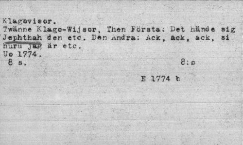 //// Klagovisor. //// Twänne Klago-Wij »or, then Första; Det hände sig Jephthah den etc. D«n Andr»;'Ack, ack, ack, si huru jag ar etc. Uo 1774. 8 s» //// E 1774 V. ////