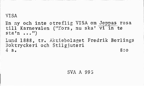 //// VISA //// En ny och inte o tre£1ig VISA om Jeppas resa till Karnevalen ("Kors, nu ska' vi in te sta!n ...") //// Lund 1888, tr. Aktiebolaget Fredrik Berlings Boktryckeri och Stilgjuteri 4 s. ' 8:o //// SVA A 99 3 ////